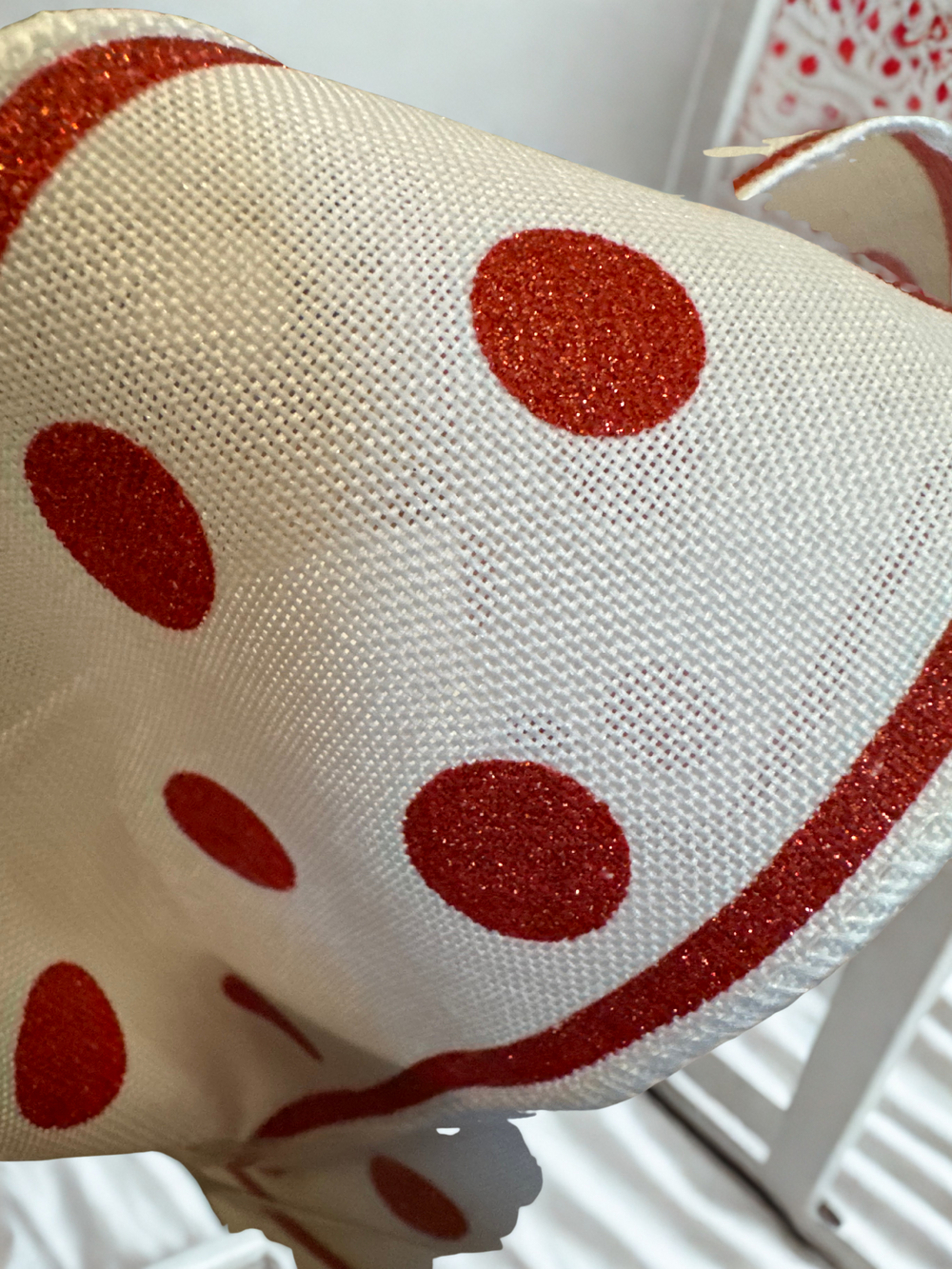 Add a pop of festive fun with our 2.5-inch White Wire Edge Ribbon, featuring bold red glitter polka dots and shimmering glitter borders on each edge.